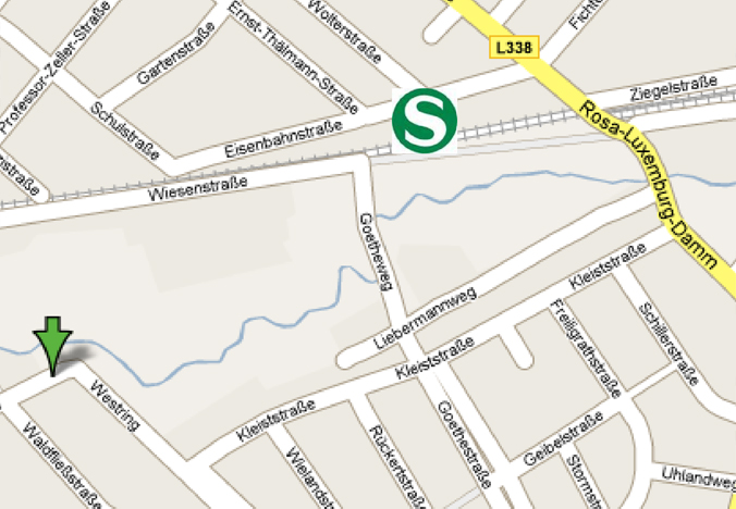 In Neuenhagen angekommen, unterqueren Sie zunächst die S-Bahn-Gleise und folgen dann von der S-Bahnstation (schräg rechts) dem Goetheweg, bis Sie die Kleiststraße erreicht haben. Die Kleiststraße begehen Sie dann rechter Hand. Am Ende der Kleiststraße biegen Sie rechts in den Westring ab. An der Kurve erreichen Sie dann unser Geschäftshaus, Westring 2a. Der Fußweg erfordert ca. 10 Minuten.
